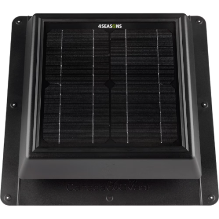 The 4 Seasons 10W solar vent is designed and built for sloped shingled roof applications. The vent works by using the suns energy to power a fan which pulls excess heat, moisture and humidity out of the attic while promoting healthy air circulation. It can operate from dawn until dusk and has a similar size and shape as traditional roof vents, allowing it to work as a regular passive vent after sun-down.