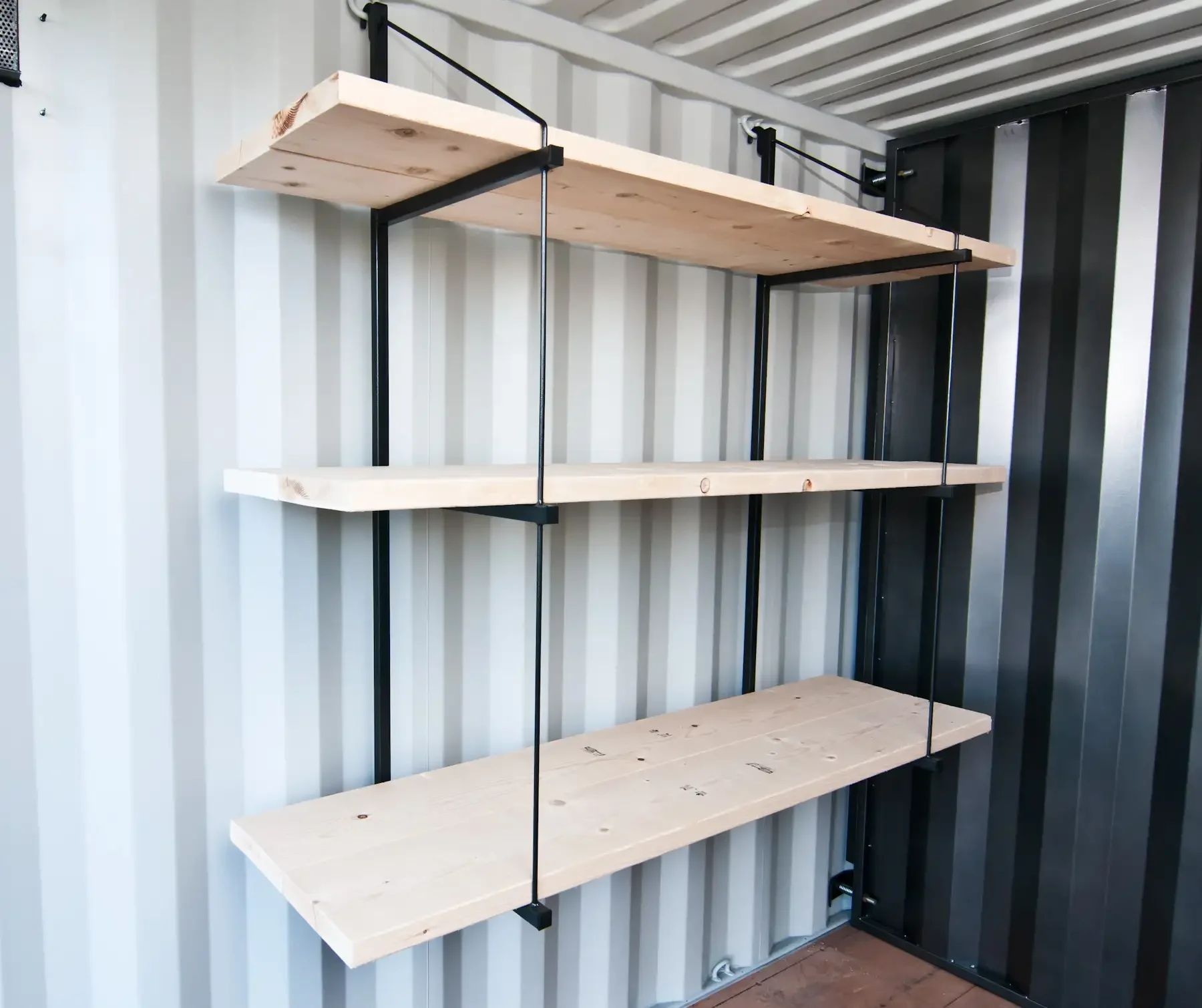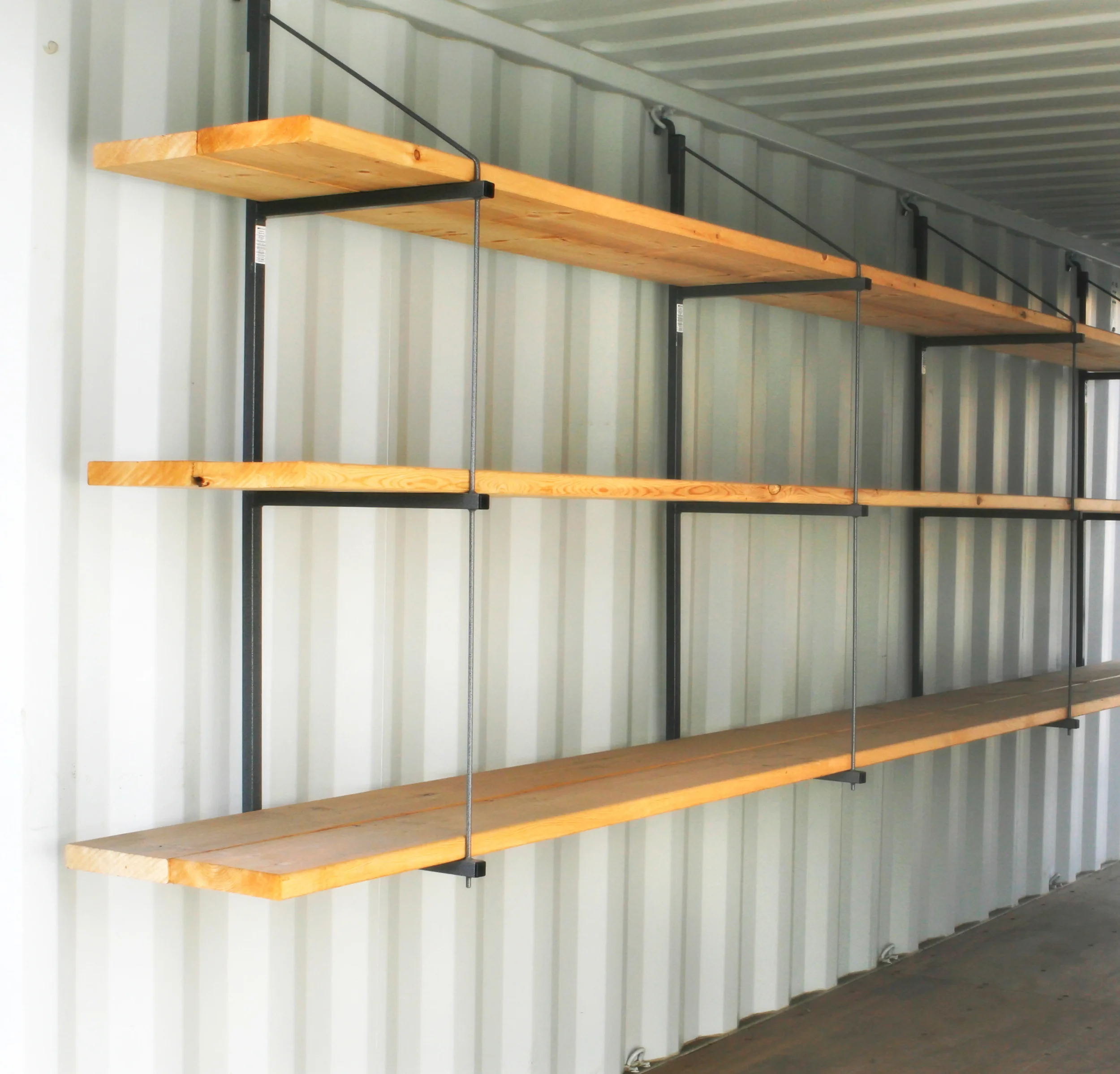 The INSTA 3-Shelf Bracket delivers superior strength while not being bulky or heavy. The brackets provide immense shelf space and rigid stock storage without interfering with valuable floor space. This shelf allows for items as large as 32” tall to be stored on the floor under the shelves (height may vary per container). The brackets pay for themselves in labour saving the first time they are used, simply hook the bracket onto the shipping container D-rings and start storing. This bracket has three tiers and uses two 2×10 pieces of construction grade wood per shelf providing an 18.5” deep shelf. Two bracket units are required to make a complete shelfing system giving you 2200 lbs. (1 ton) loading capacity. Adding an additional #3210 INSTA 3-Shelf Bracket unit increases loading capacity to 3300 lbs (1.5 tons).